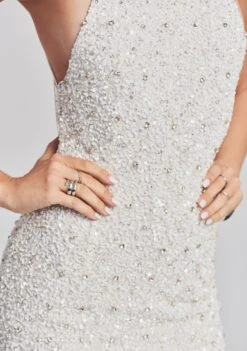 Steal the limelight in our Avalon Sequin Bodysuit. This dazzling bustier bodysuit includes a low-cut neckline and decorative gem and diamond embellishments that line its bodice and straps. Shown here in Dusty Peach.