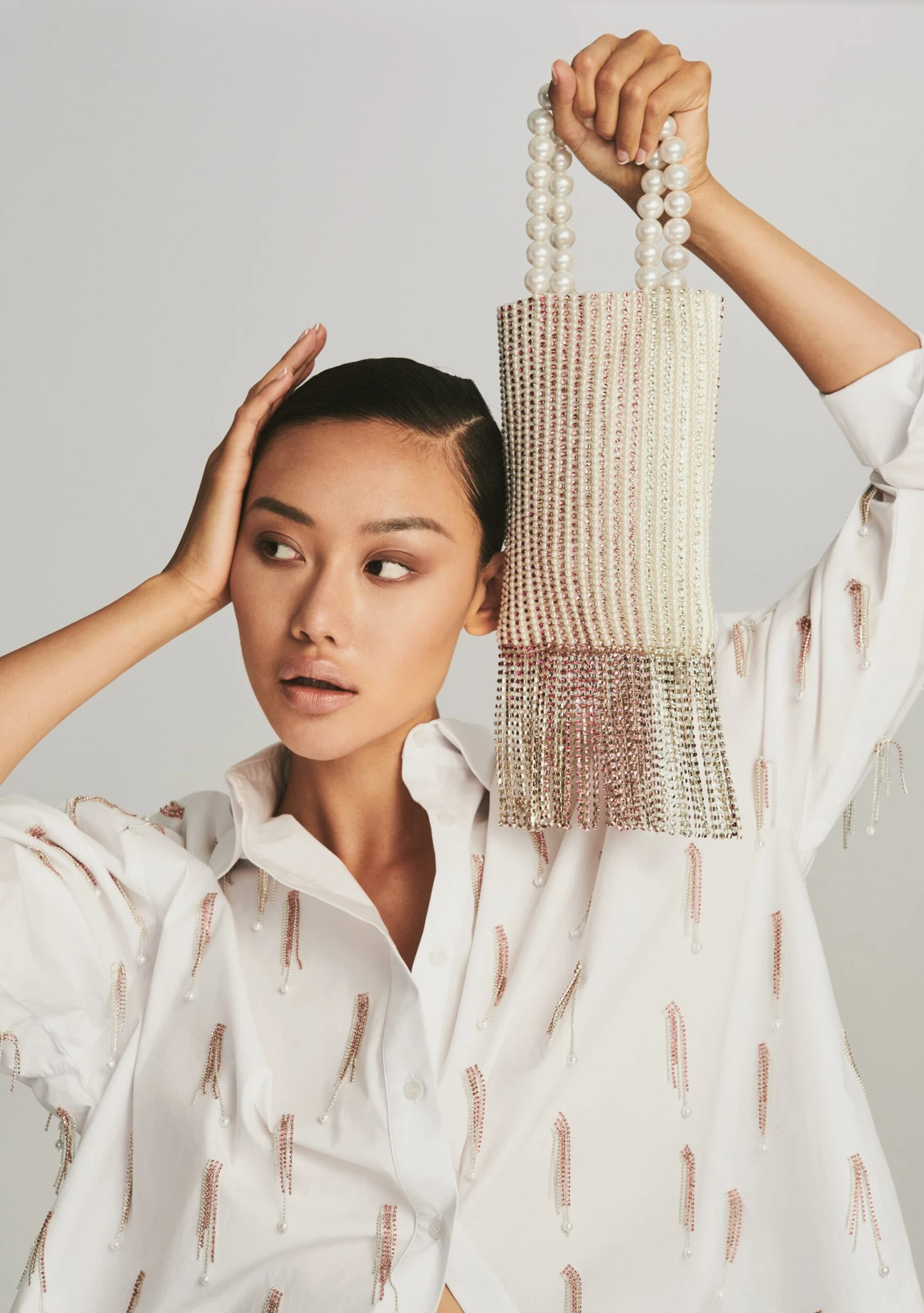 The Avery Crystal Fringe Bag will add glamour to any outfit. The mini purse features hand-beaded pearl straps and an allover jewel-toned pattern, enlivened with dangling crystal tassels. Shown here in White/Pink Ombre.