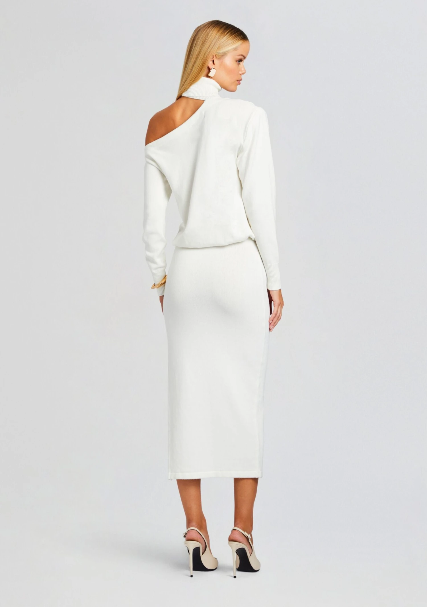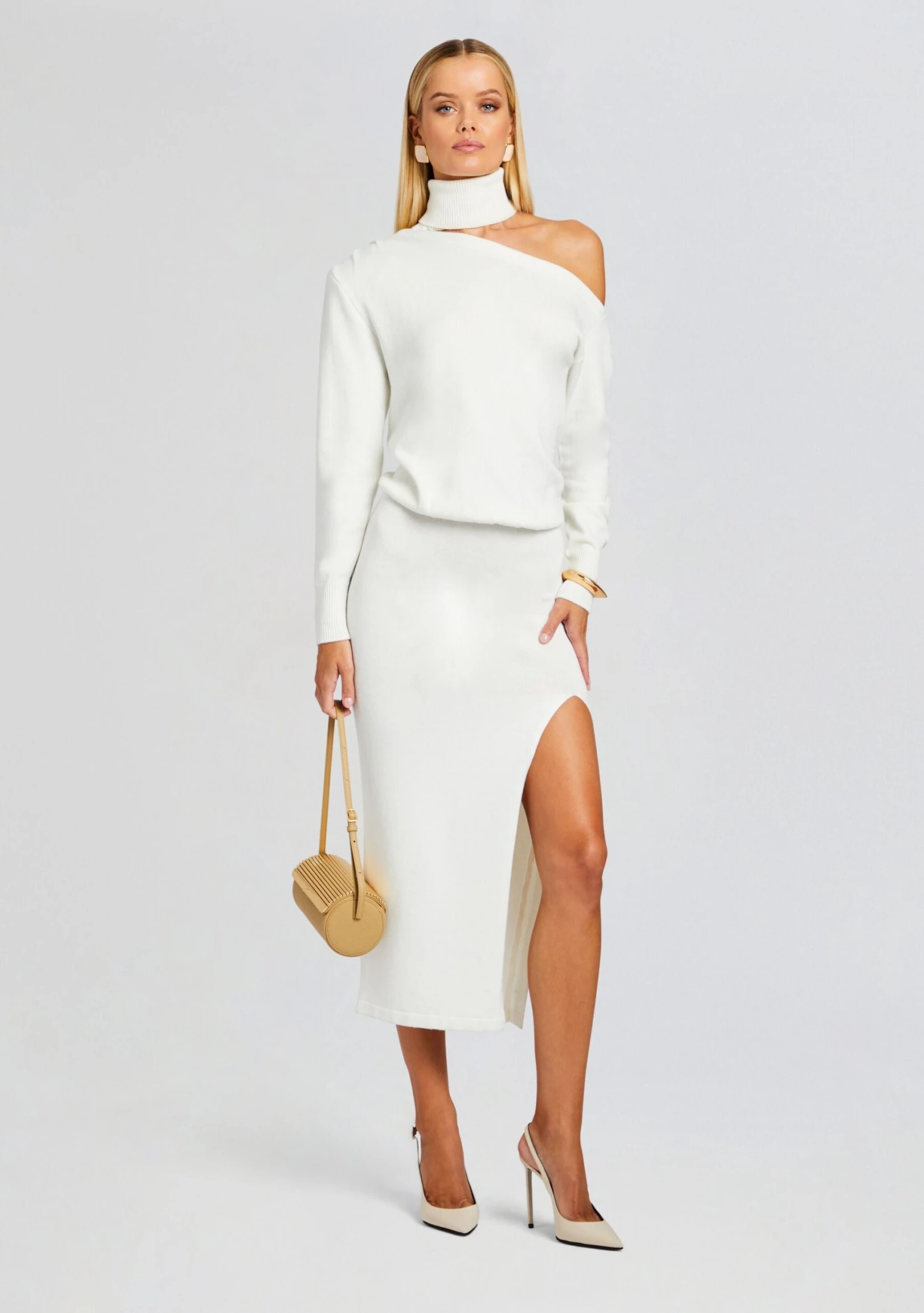 Be loungy and chic in SER.O.YA’s Charlotte Dress. This knit midi dress offers both comfort and a flattering fit. The high slit adds a touch of elegance, while the shoulder cutout provides a modern and chic aesthetic. Shown here in White.