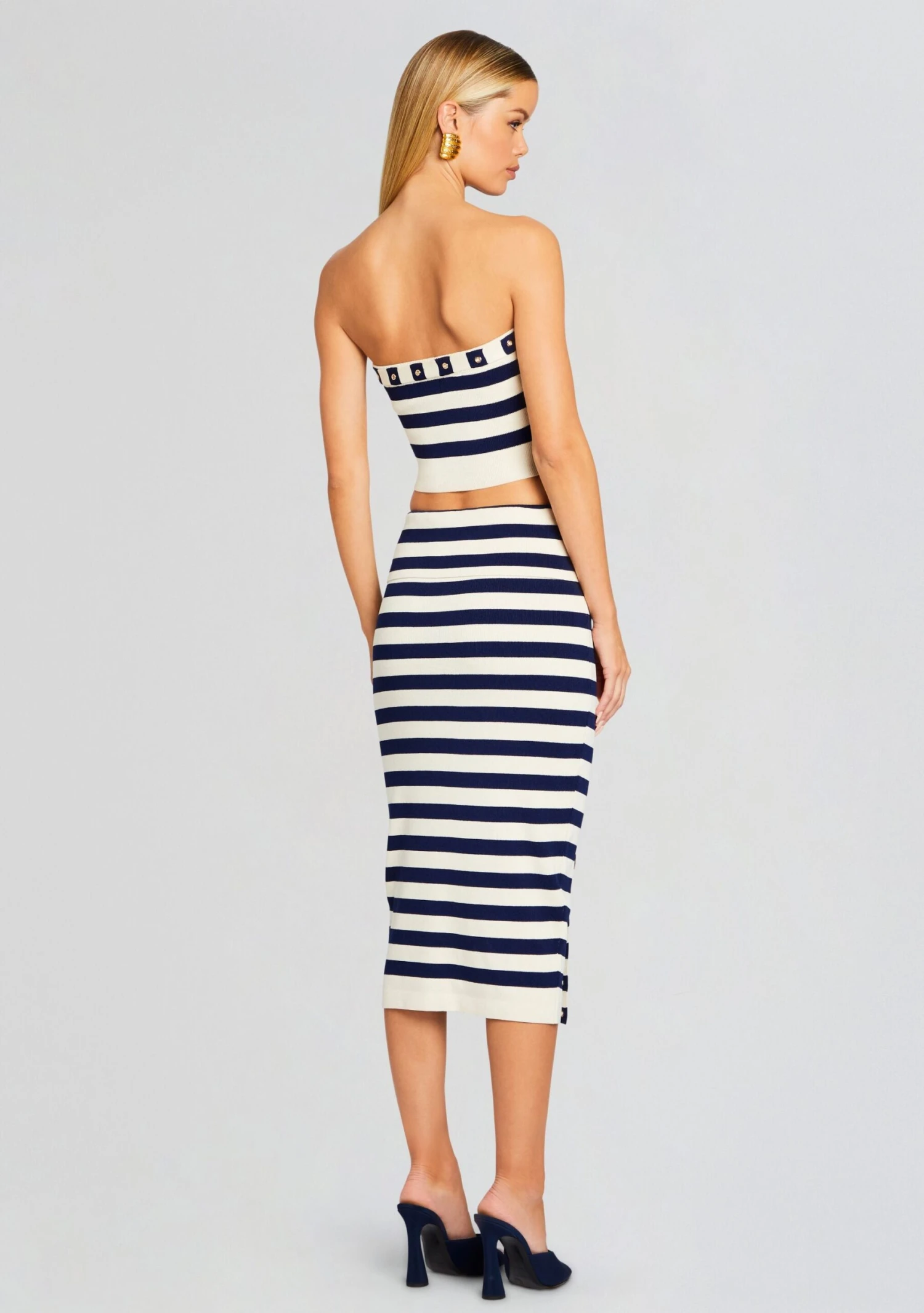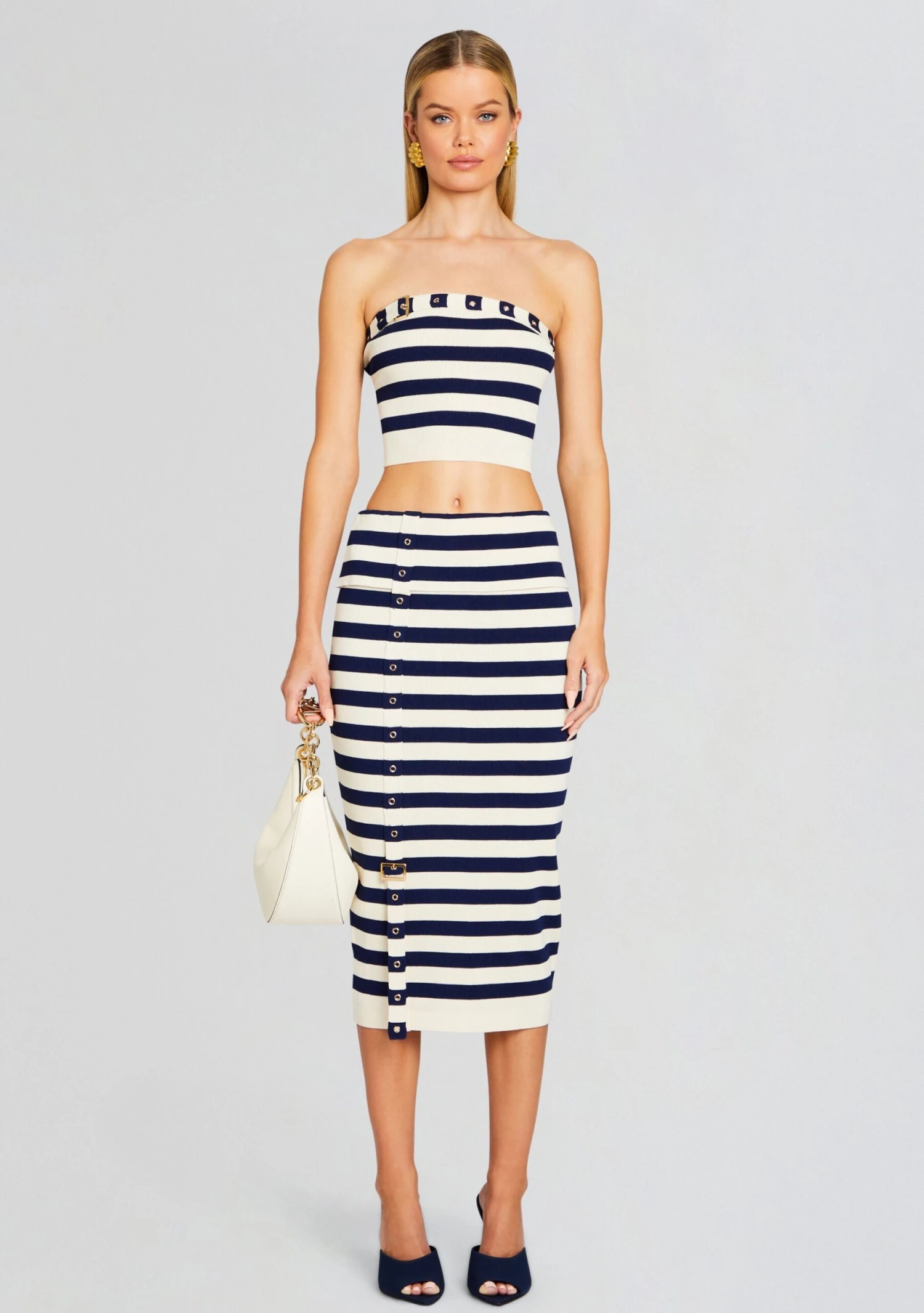 Turn heads in SER.O.YA’s chic Constance Top. This knit tube top features a trendy striped design and unique belt detailing, perfect for style and comfort. Pair with the Cleat Skirt. Shown here in Cream/Navy.