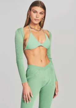 Lounge in style with the Dahlia Set by SER.O.YA. This ribbed, long-sleeve open shrug sweater features a close, cropped fit. Wear it with the matching Lux Pant for the ultimate laidback look. Shown here in Green.