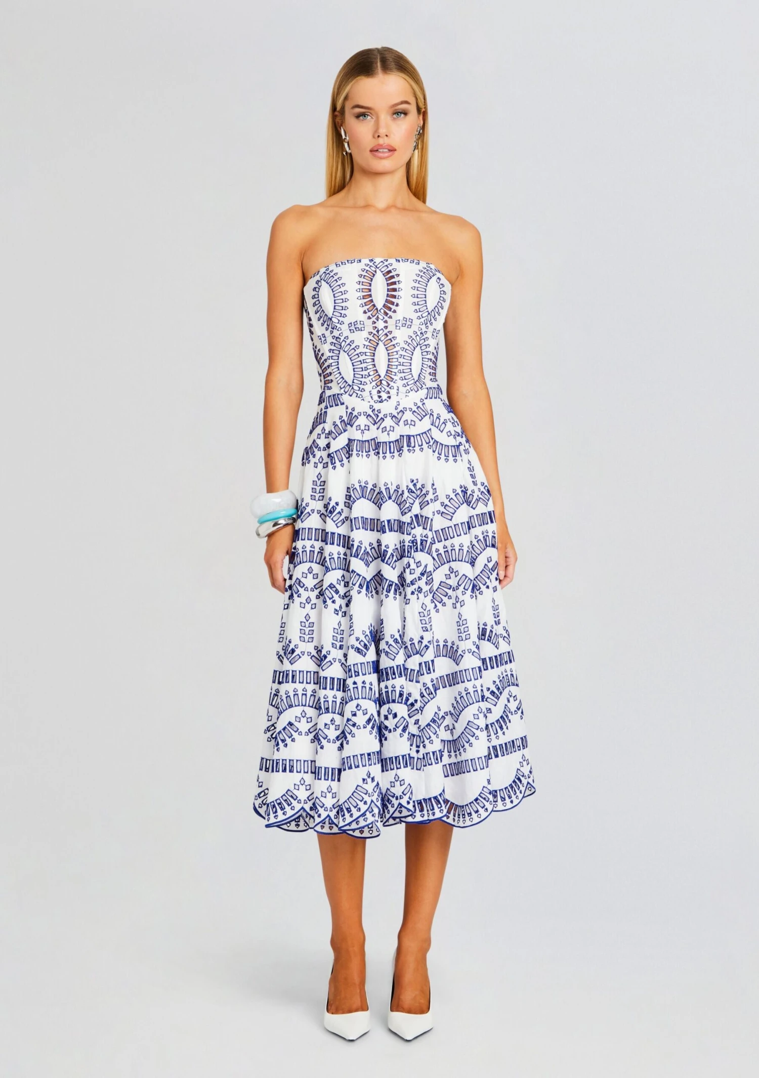 Elevate your vacation wardrobe with Charo Ruiz’s stunning Galik Midi Dress, a captivating ensemble designed to enchant wherever your travels take you. This dress exudes effortless charm with its delightful pattern, intricate cutouts, and alluring scalloped hem, making it an absolute essential for any destination getaway. Shown here in Klein Blue.