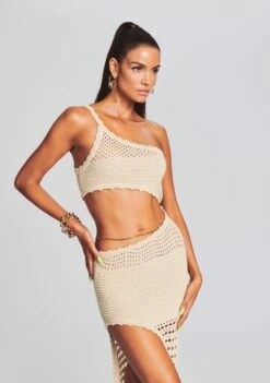 Be the main event in our Jessa Top. This sheer lace mock-neck bodysuit features long sleeves and an subtle abstract sequin pattern. Shown here in Tannin.