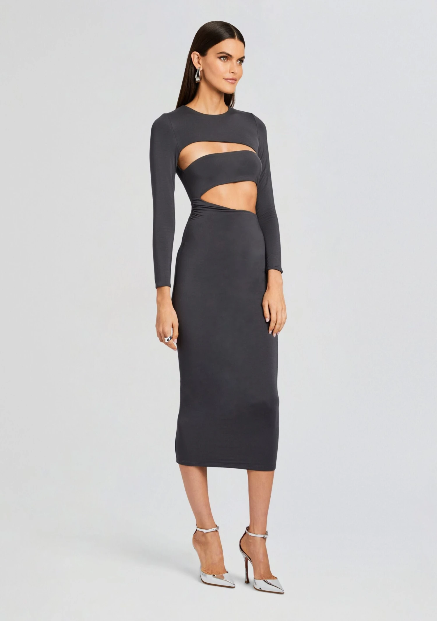 Dress Up in SER.O.YA’s Kepla Dress, a stunning bodycon midi dress with trendy cutouts. Designed to make you stand out in any crowd, this lycra dress combines elegance and style, perfect for those seeking a fashion-forward statement. Shown here in Pewter.