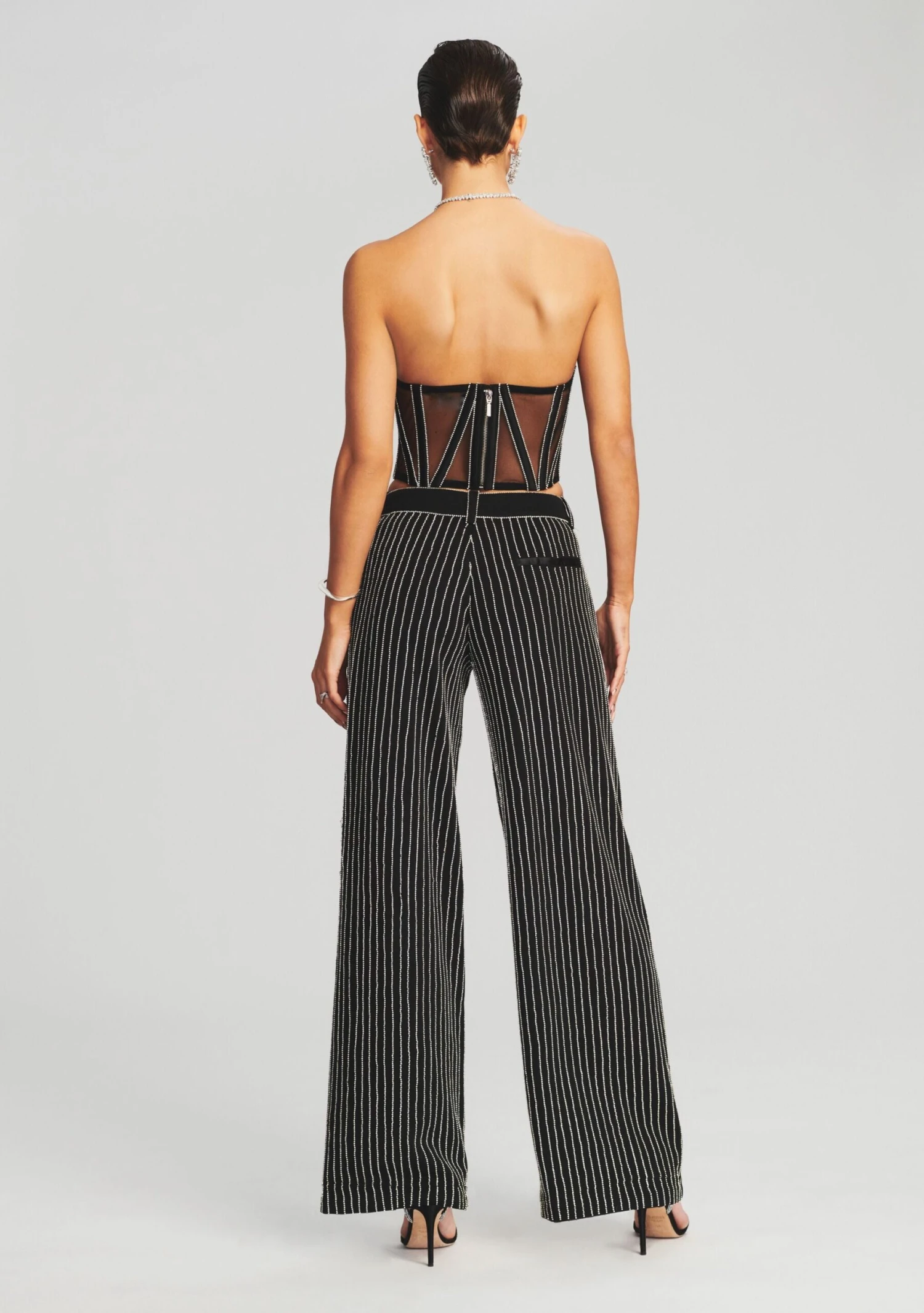 Shimmer and shine in our Lex Top. This dazzling corset bustier features a rhinestone trim alongside satin boning and mesh paneling. This strapless style is finished with an exposed zipper at the center back. Wear it on your next night out with our matching Lenox Pant and Bowery Blazer. Shown here in Black.