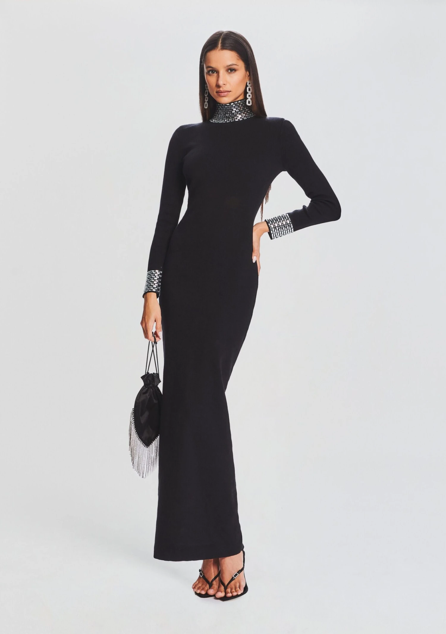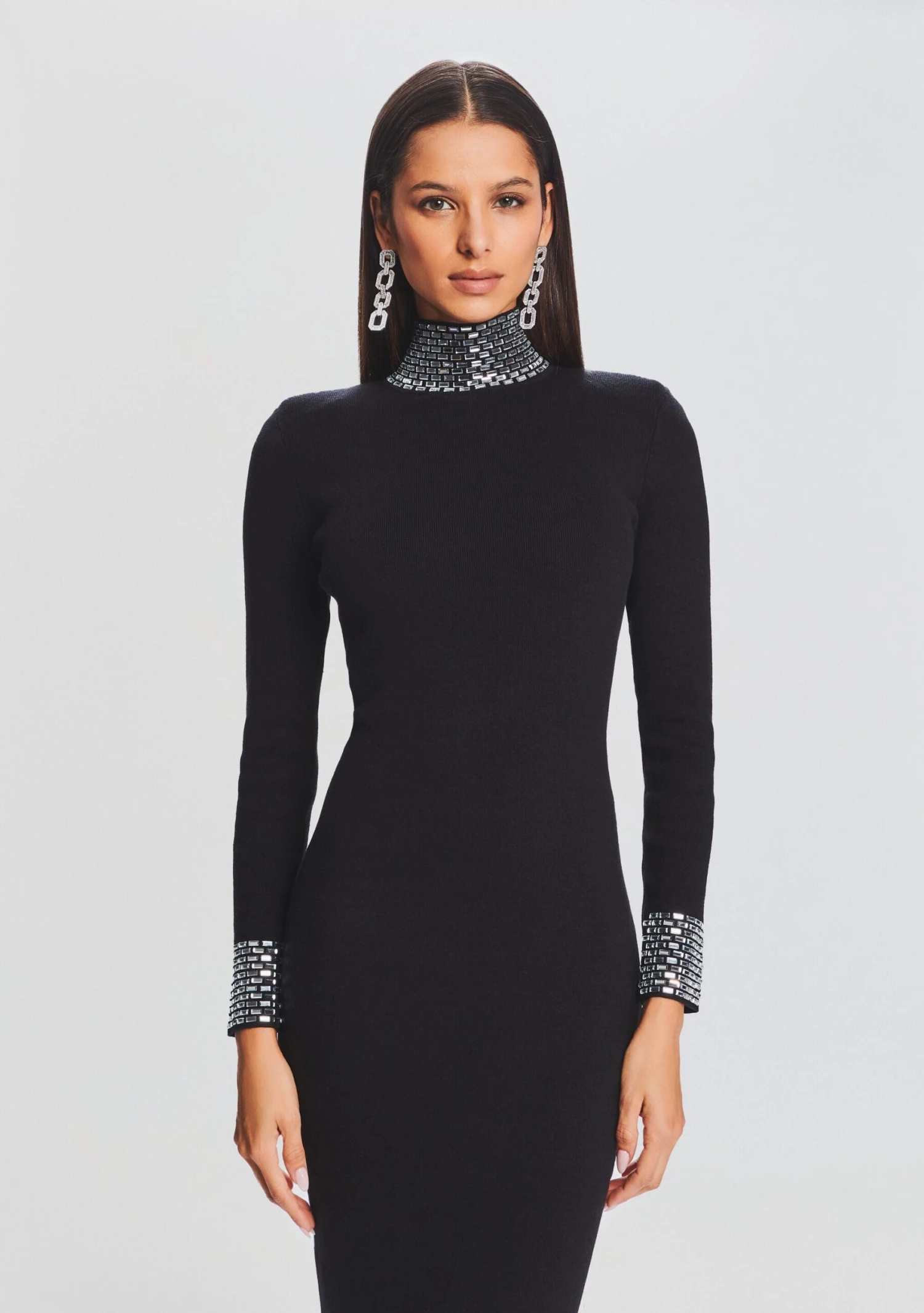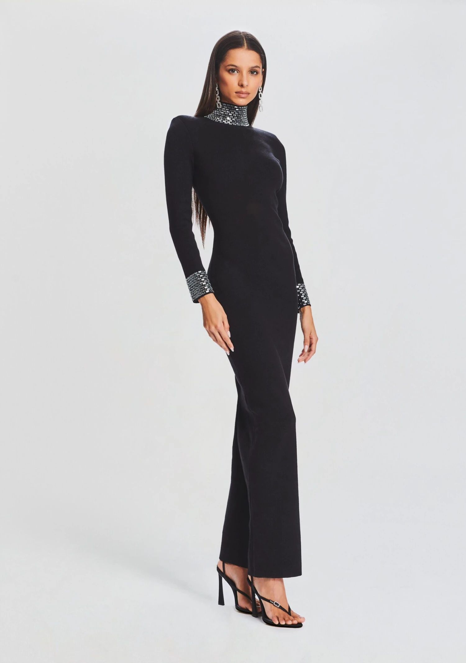 Step into sophistication with our Monroe Dress, boasting a long sleeve design, embellished high neck, and sequin cuffs. This knit, sweater-like gown exudes grace, class, and comfort, making it the perfect choice for gala nights and upscale events. The delicate embellishments on the turtle neck and cuffs add a hint of luxury, elevating your style effortlessly. Shown here in Black.