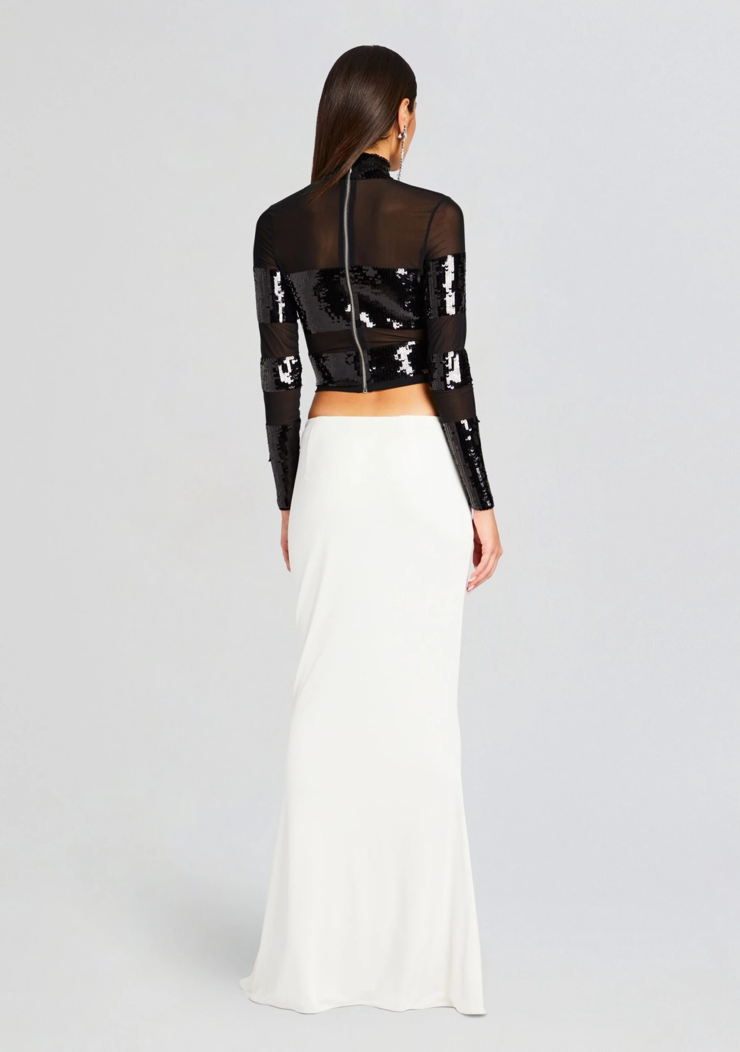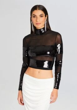 Step into elegance in out Nyx Top, a stunning piece that combines sheer beauty with dazzling sequined accents. Featuring sequin and sheer detailing throughout, long sleeves and zip back closure this top offers a unique blend of sophistication and allure. The sequined high neck adds a touch of opulence and refinement, elevating your look with its striking design. Shown here in Black.