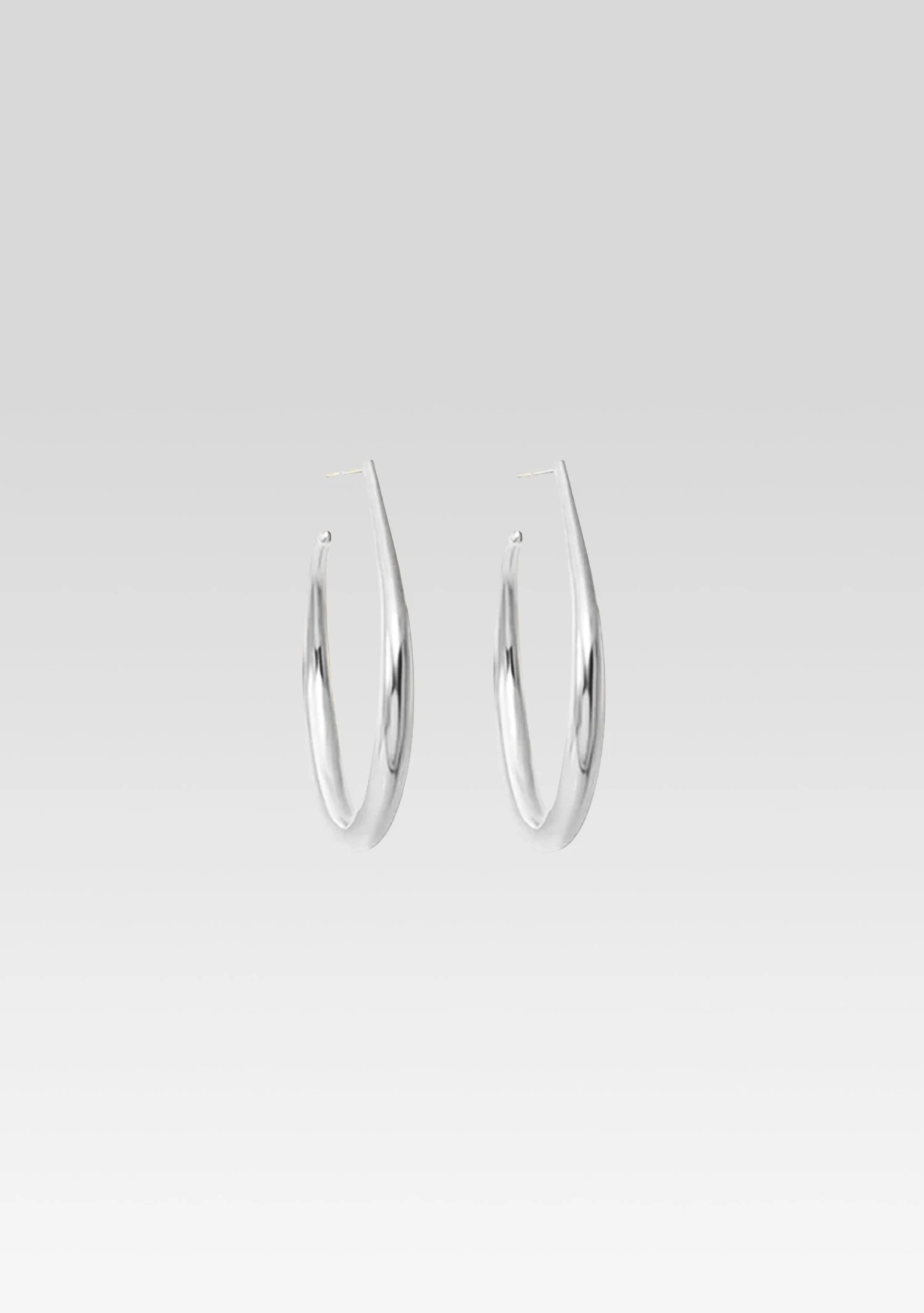 Finalize your look with Keren Wolf’s Moon Hoop Earring featuring a drop shaped hoop design. Shown here in Silver.