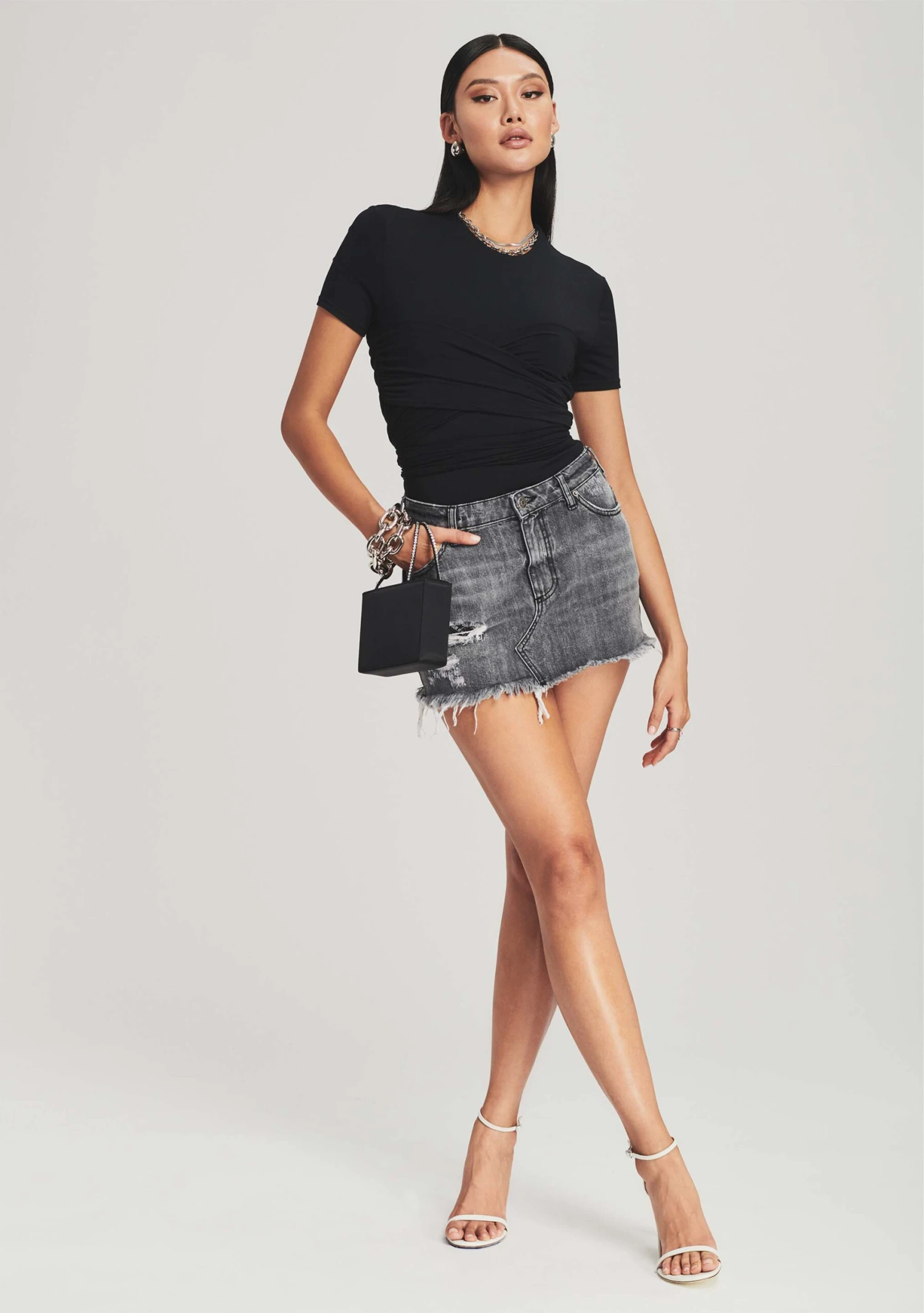 From work to play, the Stella T-Shirt can do it all. Designed with a wrap around tie at the waist, the high neck tee is crafted in a smooth silk blend. Shown here in Black.