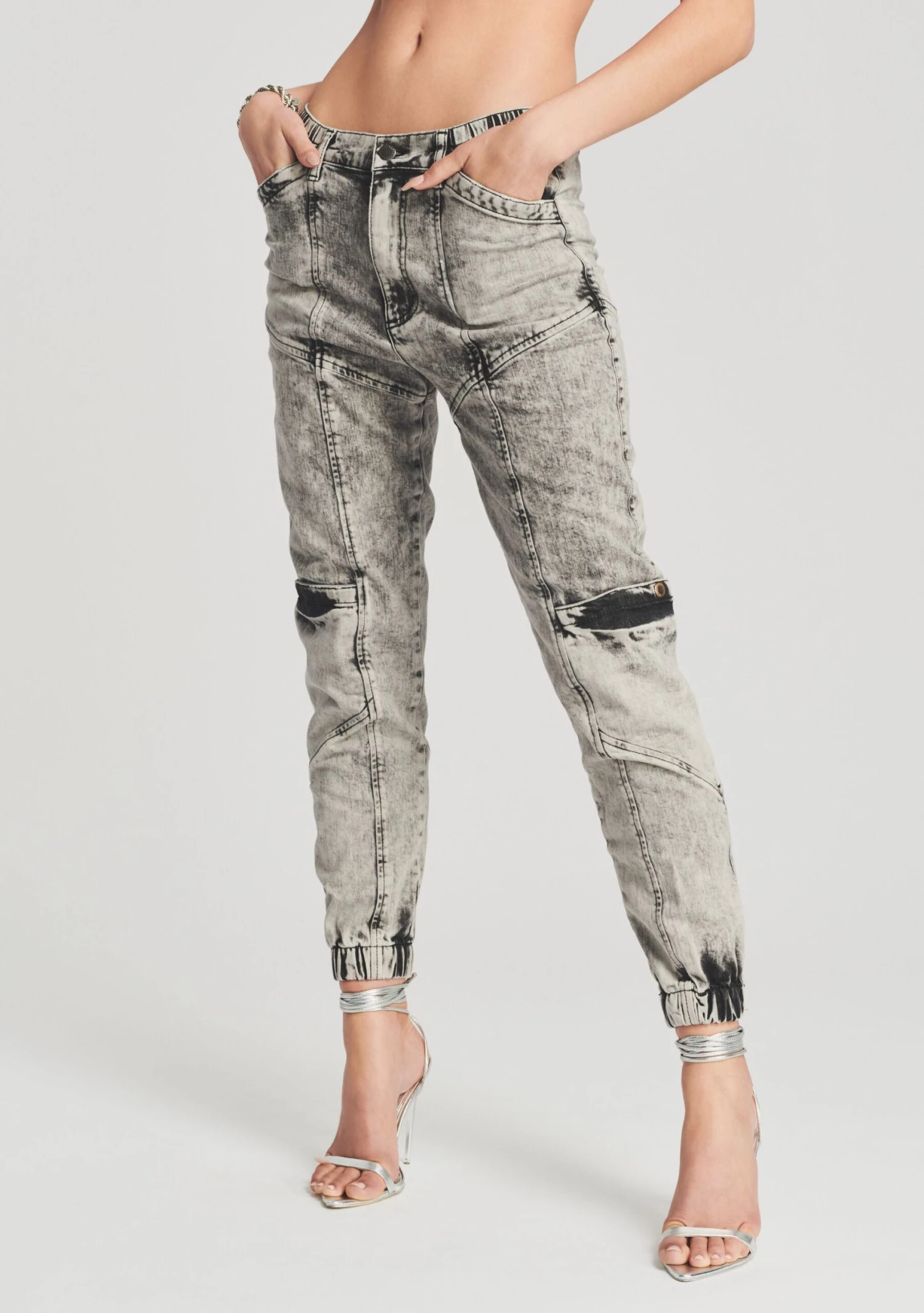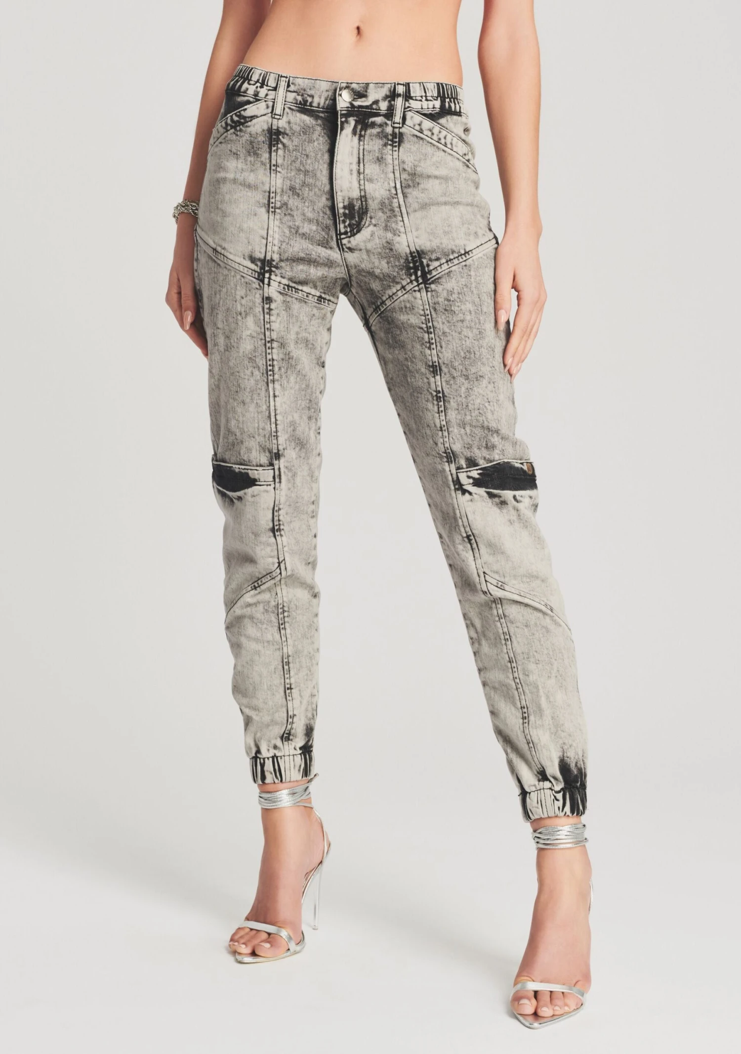 The Tatum Jean offers a fresh take on classic joggers. Cut in acid-washed denim, the pant is designed with a gathered elastic waist, elasticized hems, and oversized patch pockets at the waist and down the legs. Wear them with a tucked-in tee and sneakers. Shown here in Acid Grey.
