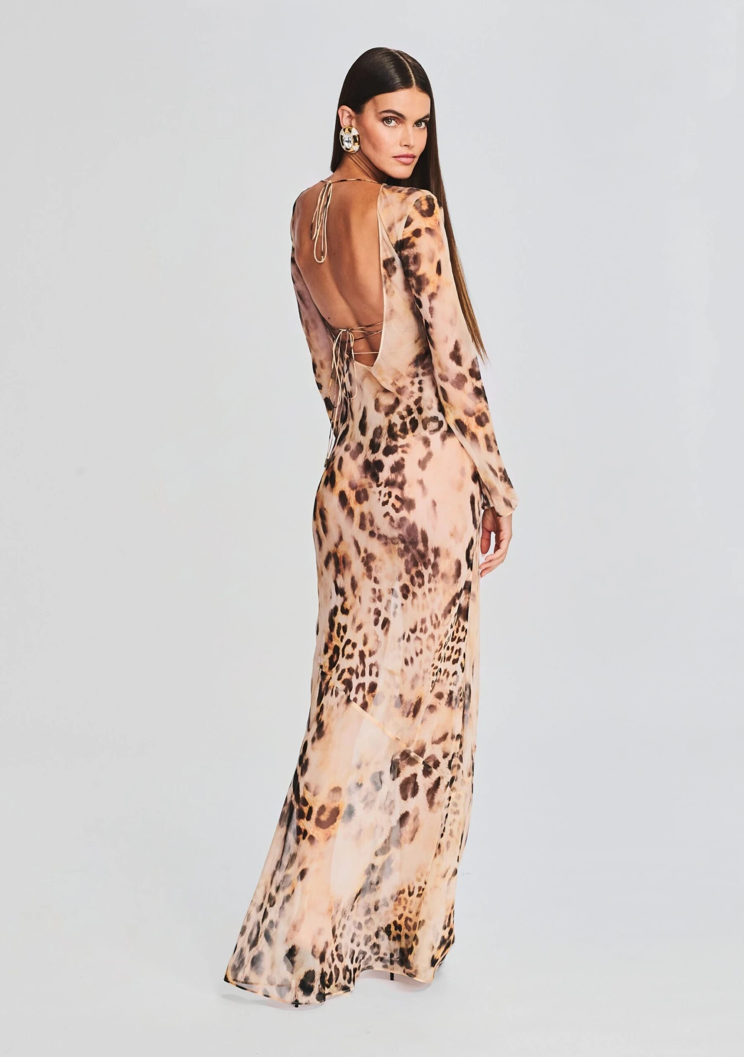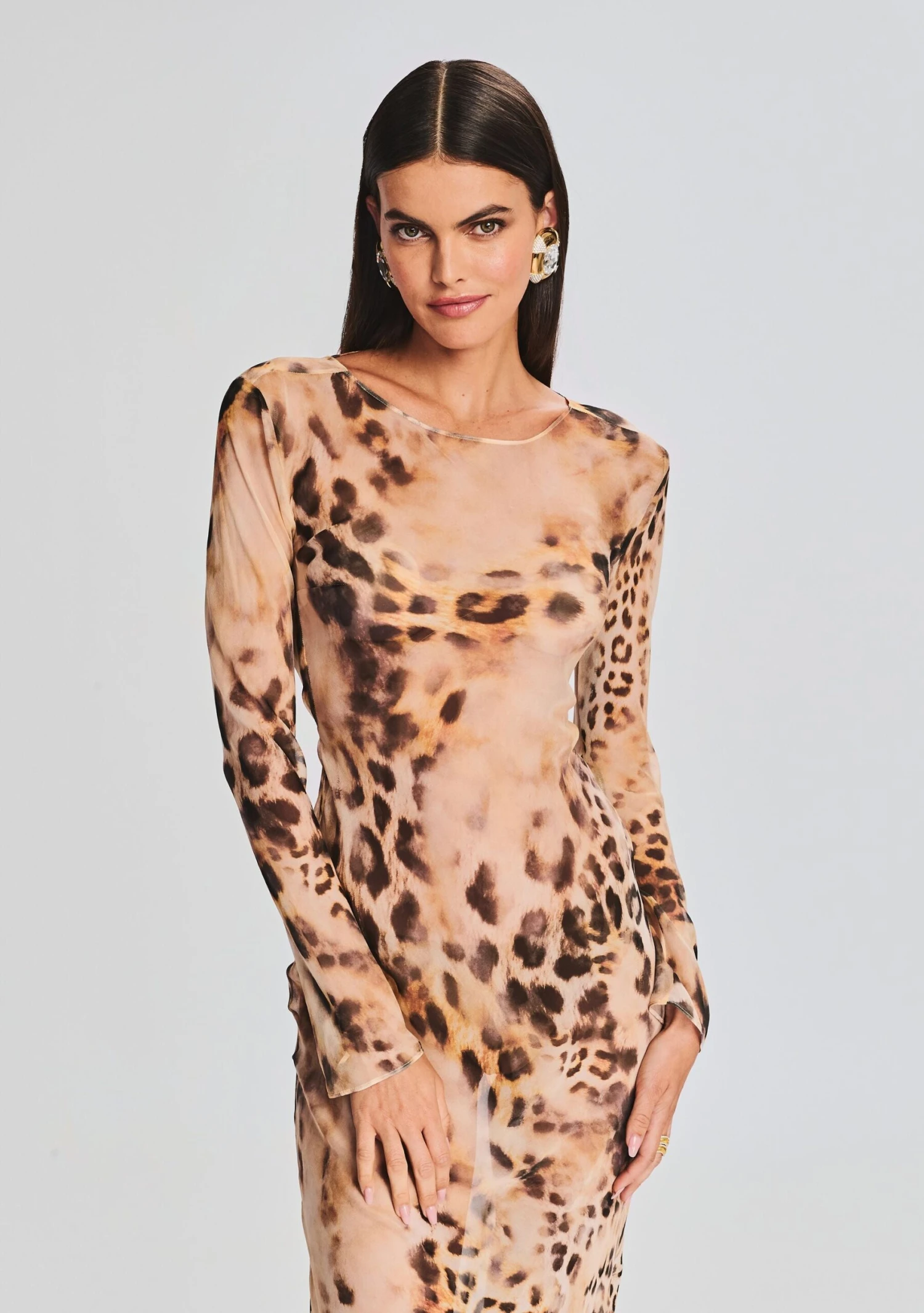 Channel sophistication in our Vienna Dress. This sheer floor length silhouette is designed with long sleeves, a flowing hem, and a daring cheetah print pattern. Shown here in Vintage Cheetah.