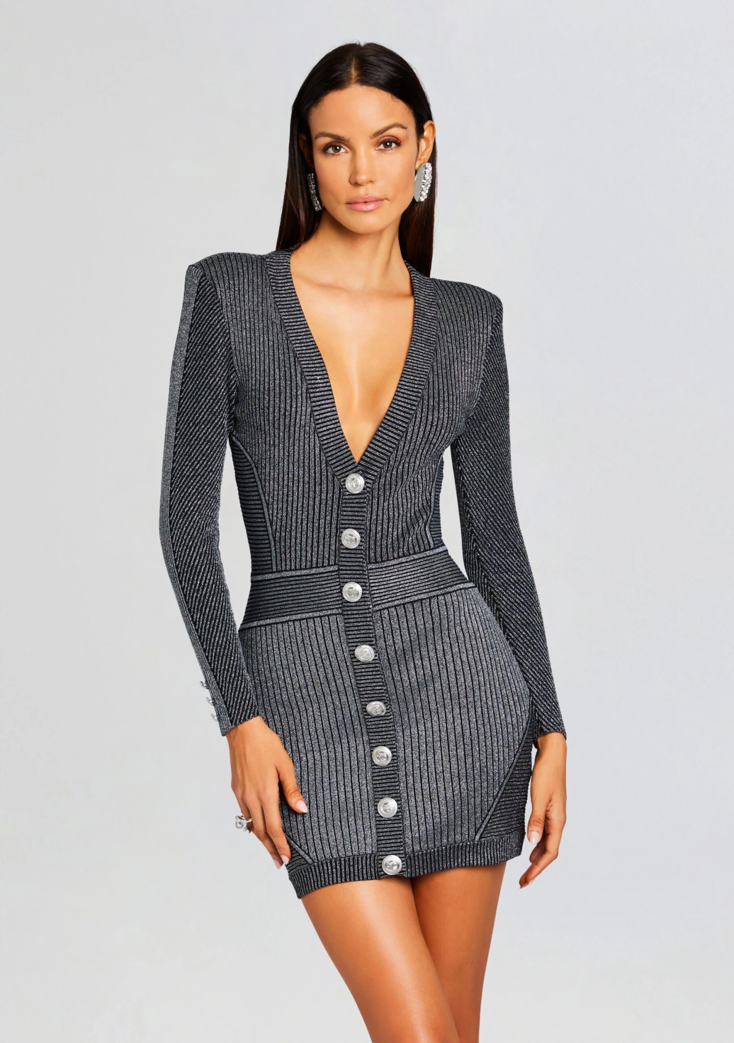 Step into the world of elegance and comfort with our Zem Dress. This stunning piece boasts a button-up front, shoulder pads for added structure, and long sleeves, making it the perfect choice for cocktail parties or formal gatherings. It’s a combination of style, comfort, and sophistication. Shown here in Metallic Black/Silver.